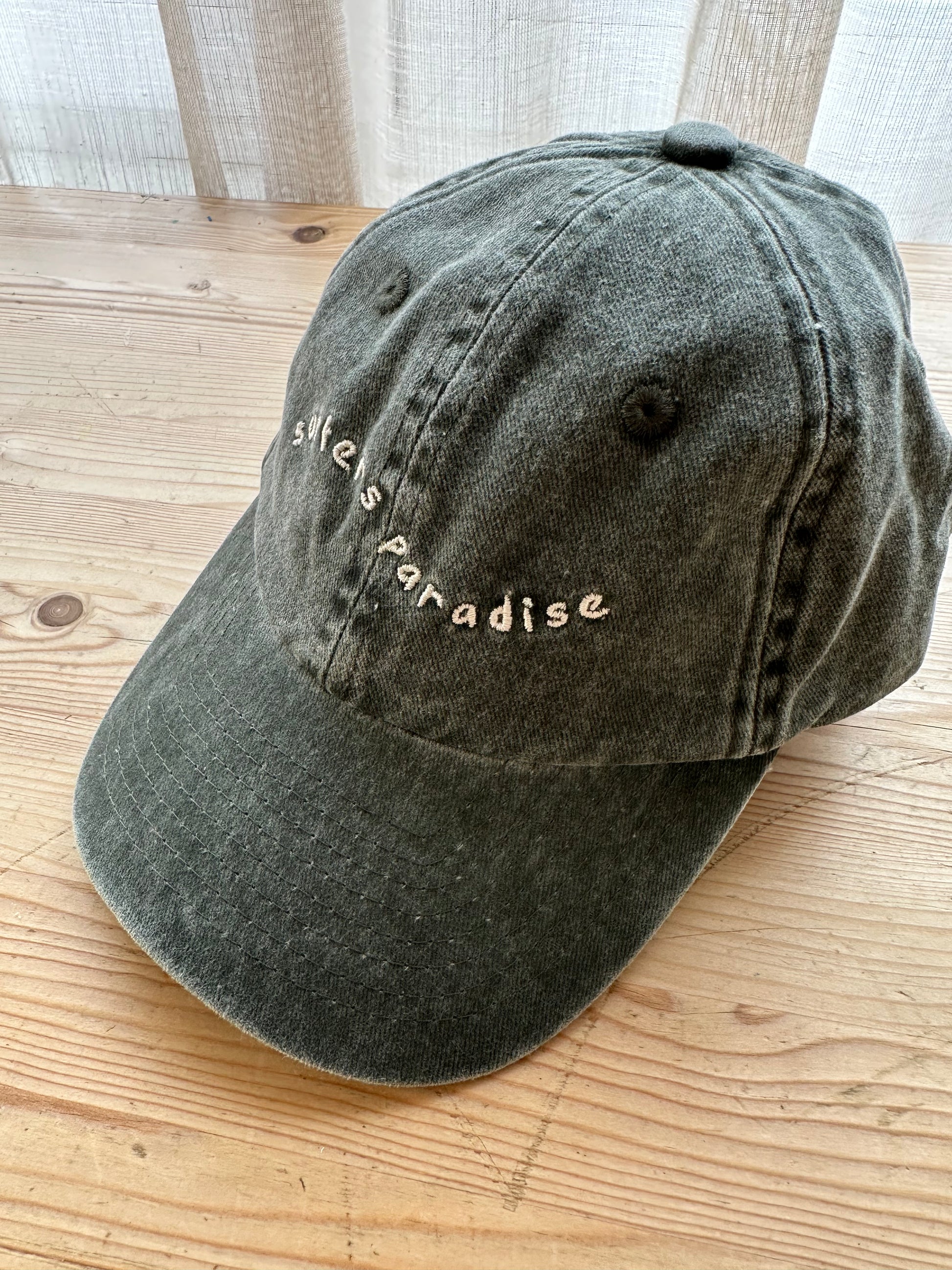 our surfers paradise cap in washed green for a vintage look. made from 100% cotton with high quality embroidery.
