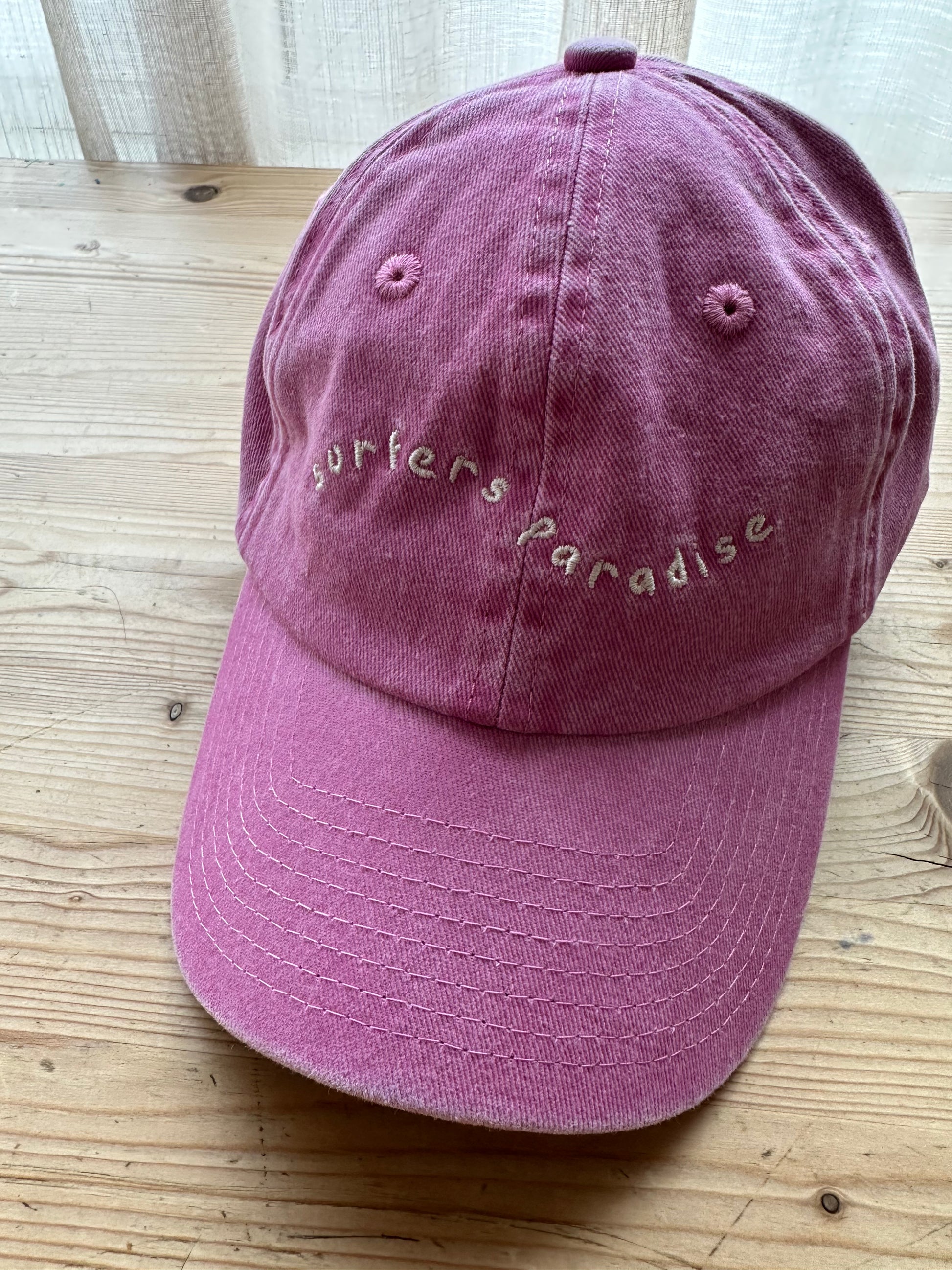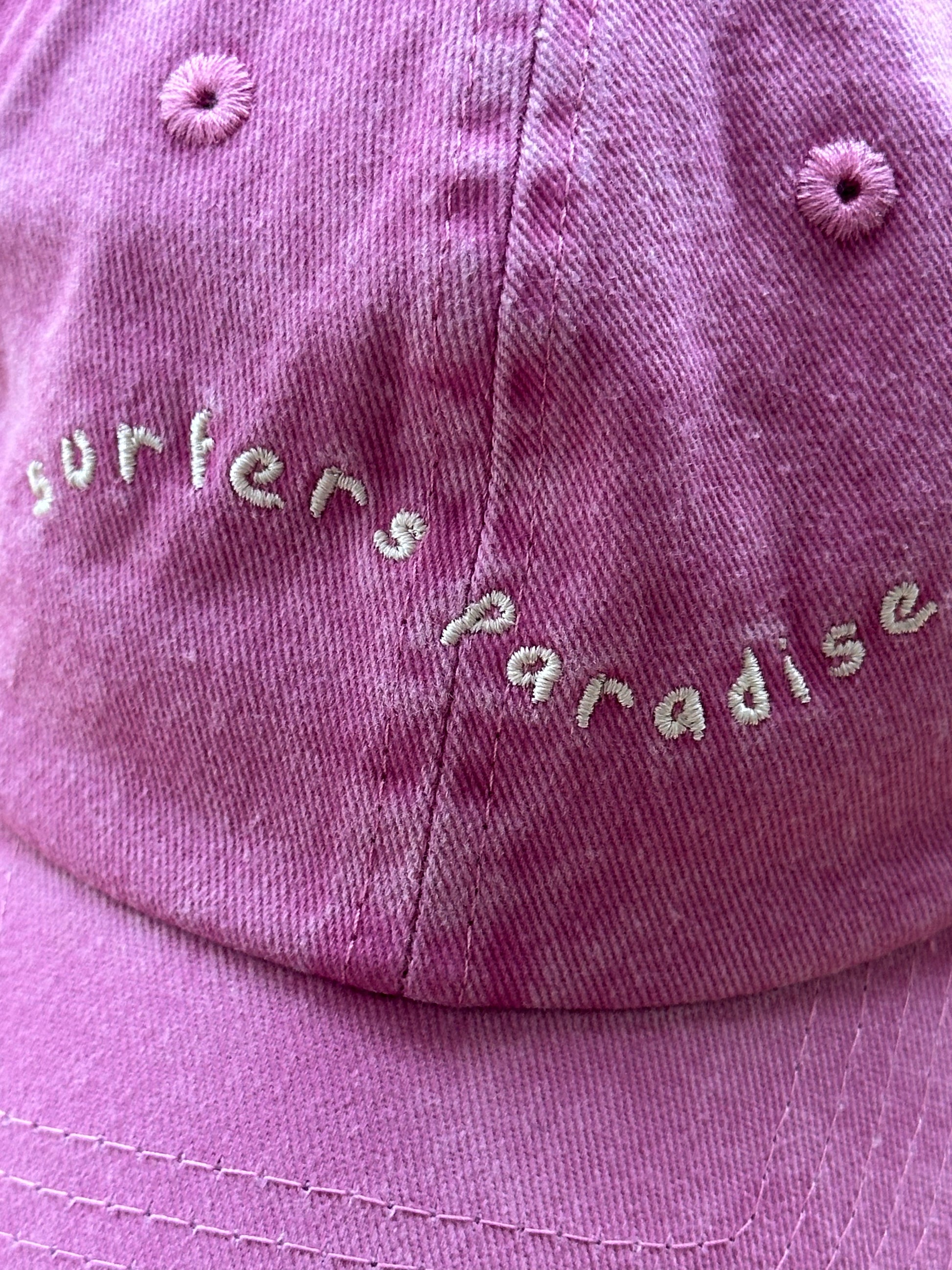 our surfers paradise cap in washed pink for a vintage look. made from 100% cotton with high quality embroidery.