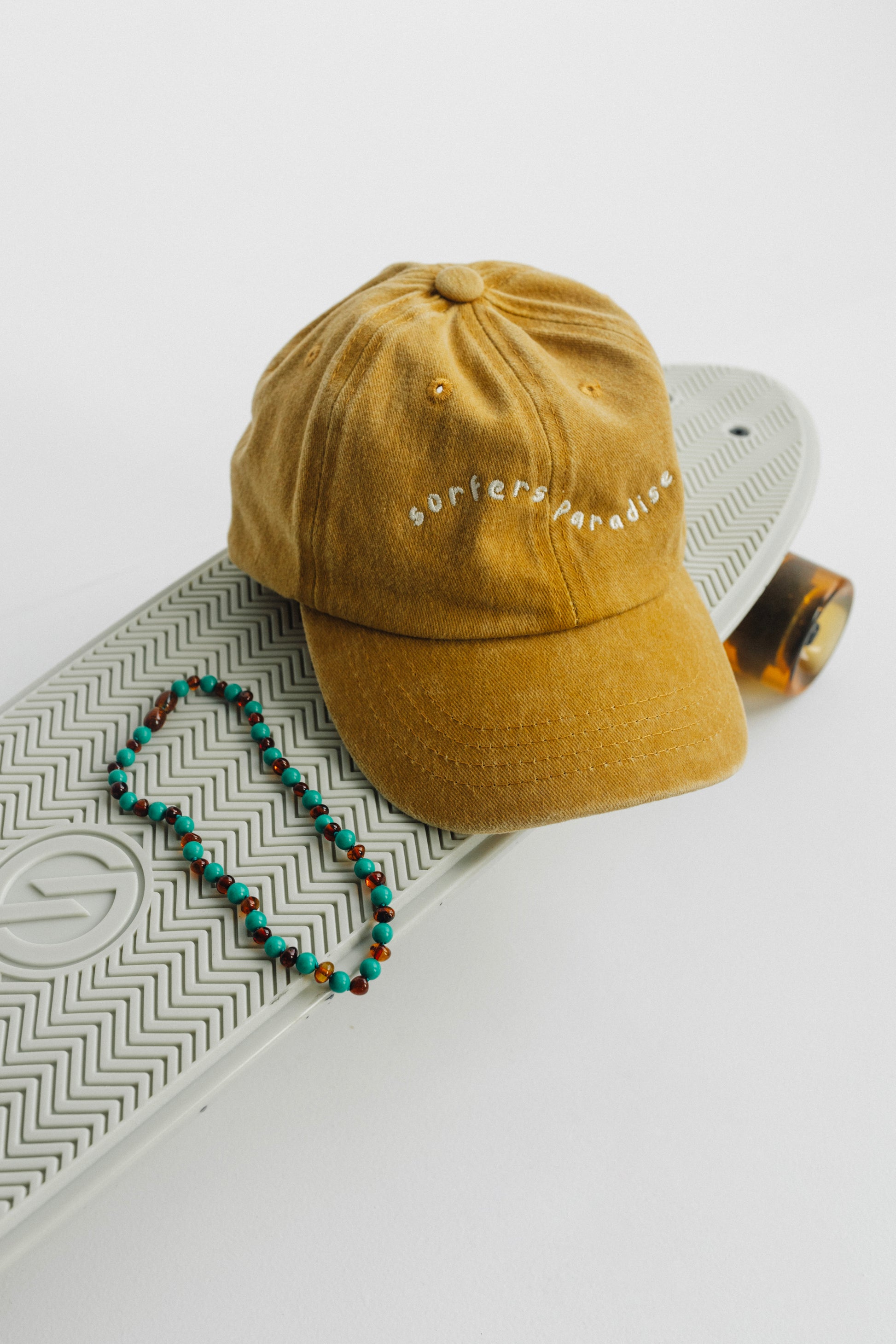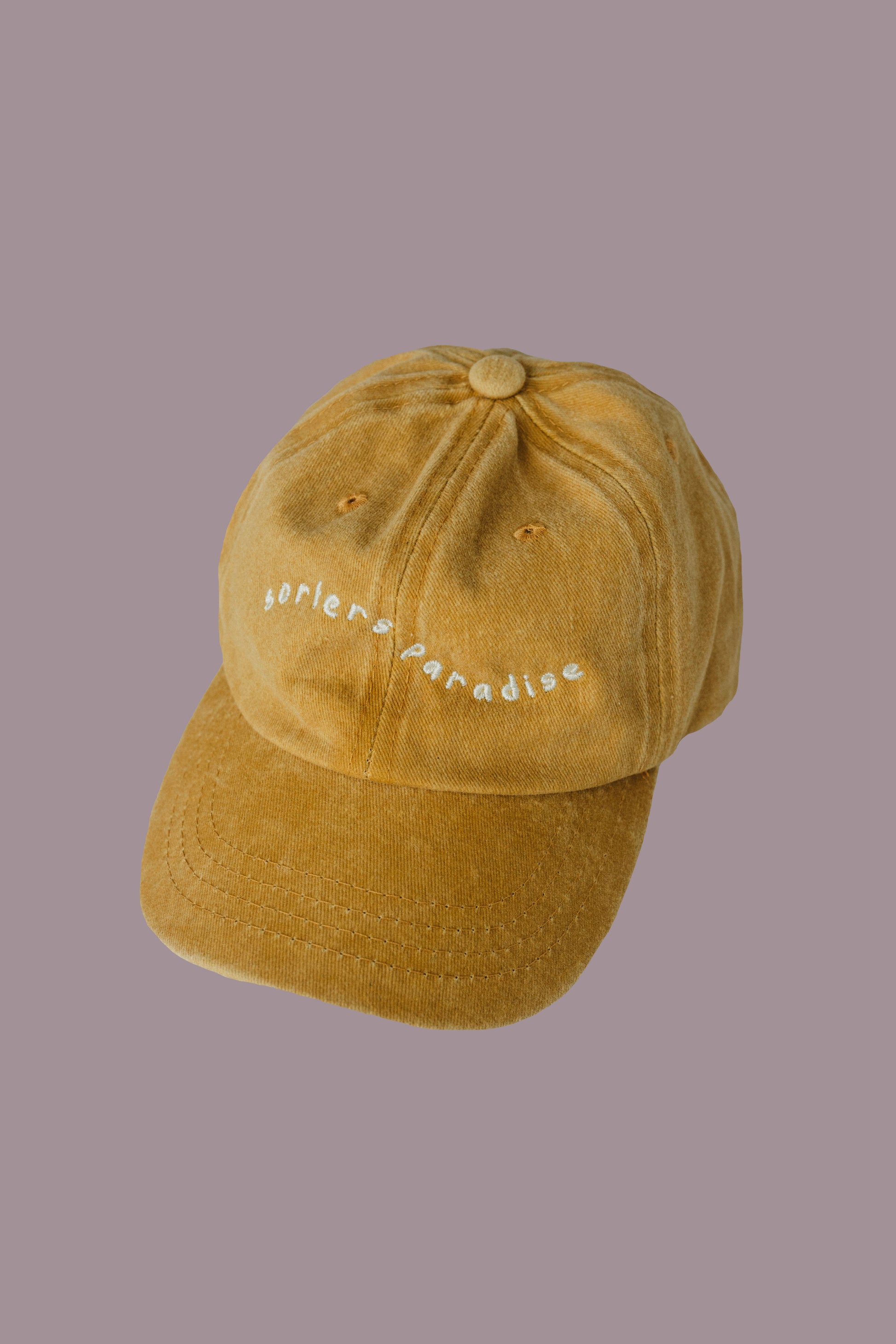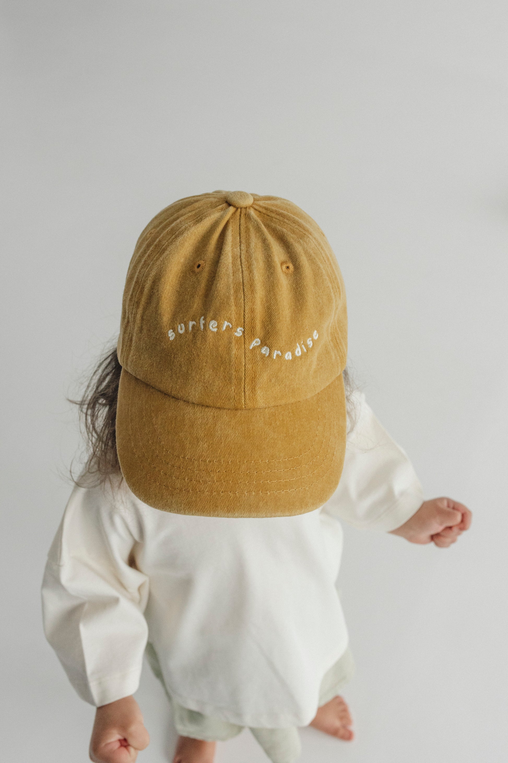 our surfers paradise cap in washed yellow for a vintage look. made from 100% cotton with high quality embroidery.