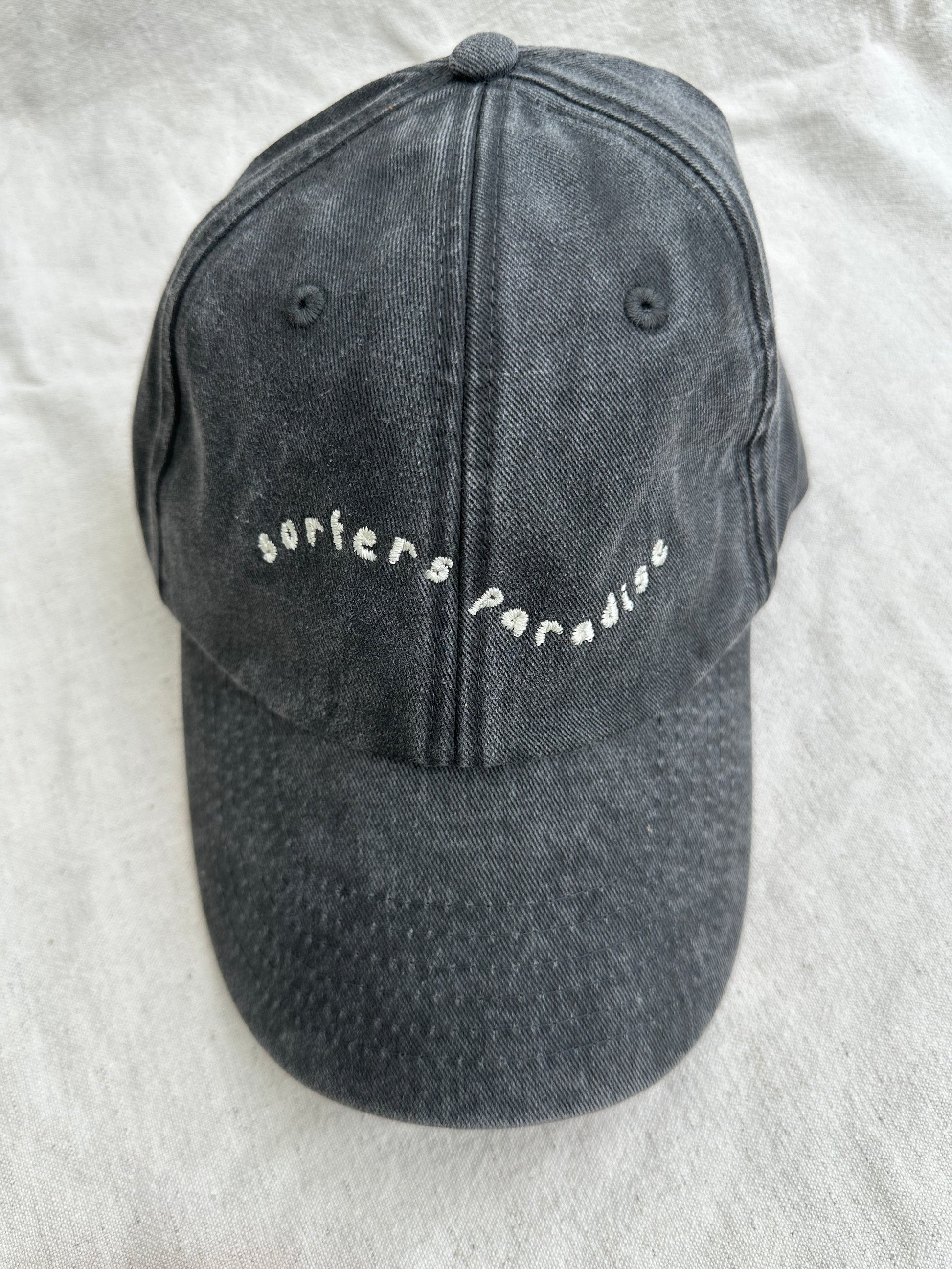 our surfers paradise cap in washed black for a vintage look. made from 100% cotton with high quality embroidery. made for twinning with your kiddos 🫶🏼