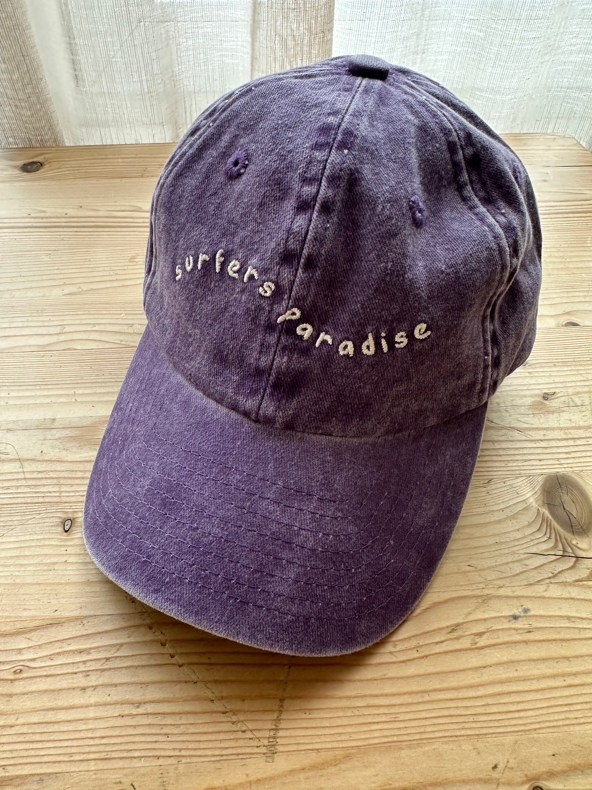 our surfers paradise cap in washed purple for a vintage look. made from 100% cotton with high quality embroidery.